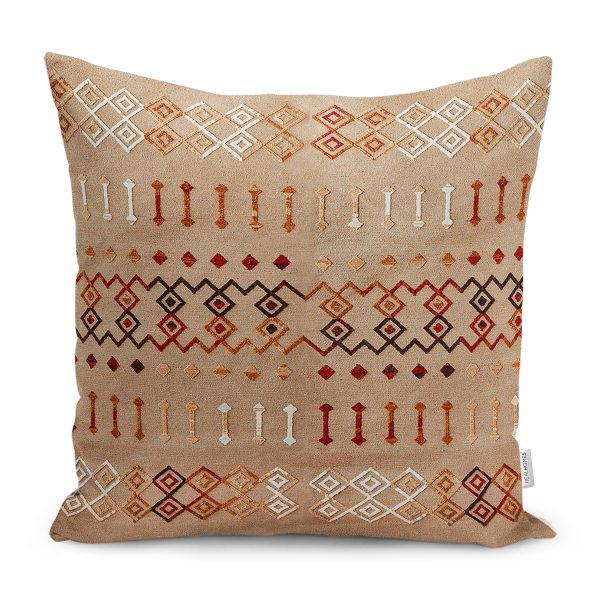 RealHomes Kahverengi Zeminde Geometrik Motifli Etnik Desenli Dijital Baskılı Yastık Kırlent Kılıfı