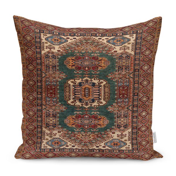 RealHomes Kahverengi Zeminde Kilim Motifli Anadolu Desenli Dijital Baskılı Yastık Kırlent Kılıfı