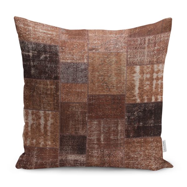 RealHomes Kahverengi Zeminde Patchwork Motifli Geleneksel Desenli Dijital Baskılı Yastık Kırlent Kılıfı