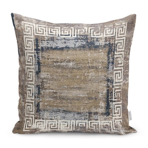 RealHomes Kahverengi Zeminde Çerçeveli Eskitme Desenli Dijital Baskılı Yastık Kırlent Kılıfı