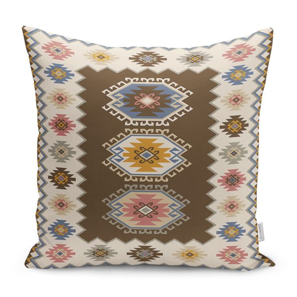 RealHomes Kahverengi Zeminde Etnik Motifli Kilim Desenli Dijital Baskılı Yastık Kırlent Kılıfı