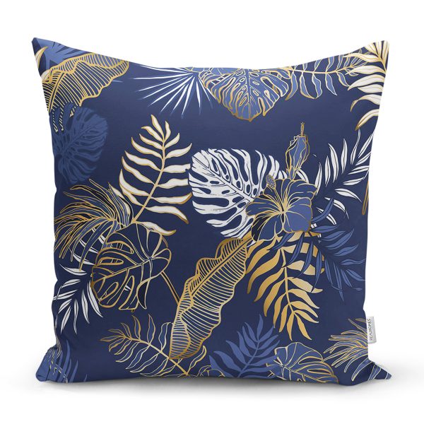Mavi Zemin Üzerinde Gold Detaylı Yaprak Desenli Modern Yastık Kırlent Kılıfı
