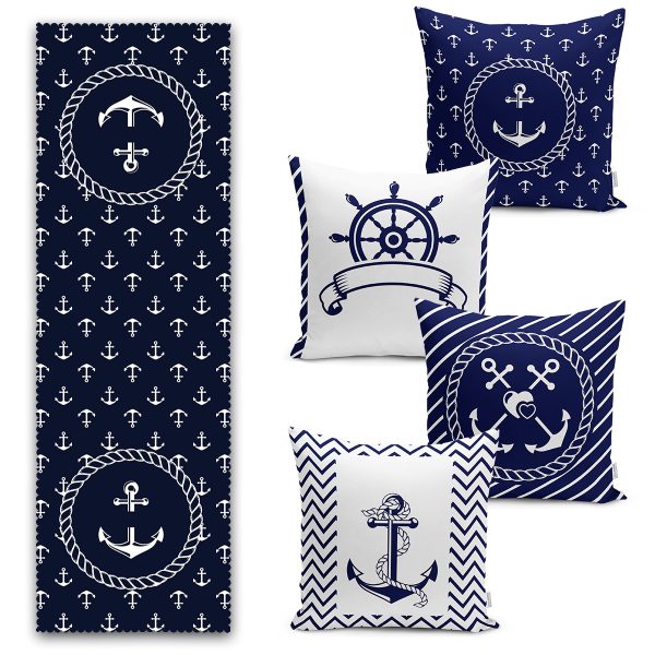 Lacivert Denizci Desenli Çapa & Dümen Tasarımlı 4 Kırlent 1 Runner Seti