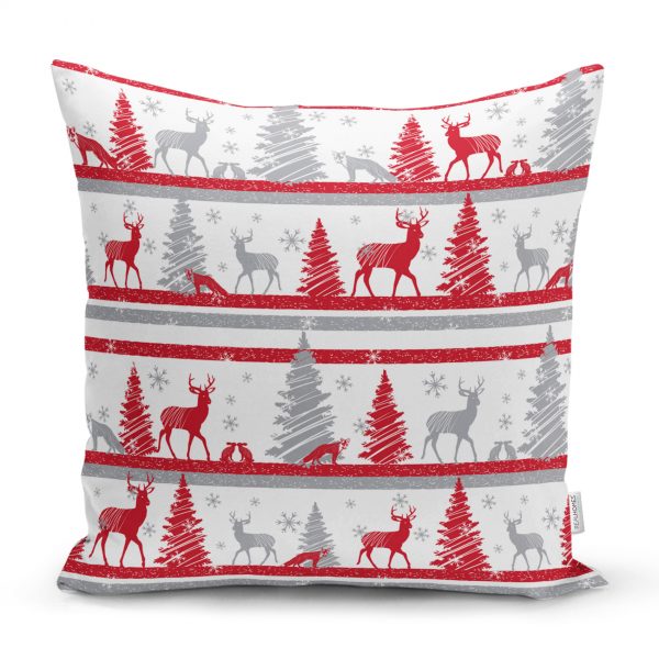 Kırmızı Geyikler ve Ağaçlar Yılbaşı Konseptli Dijital Baskılı Yastık Kırlent Kılıfı