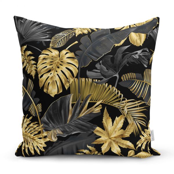 Siyah Zeminde Altın Yapraklar Desenli Dekoratif Yastık Kırlent Kılıfı