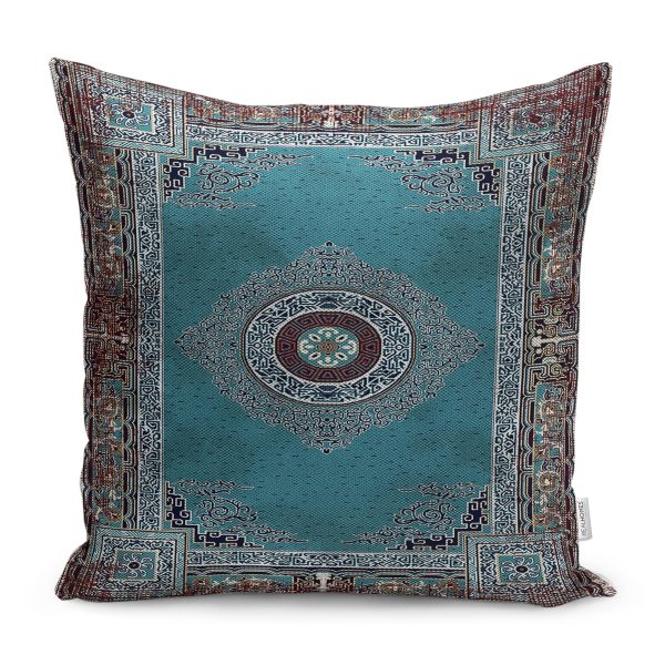 RealHomes Mavi Zeminde Hereke Motifli Otantik Desenli Dijital Baskılı Yastık Kırlent Kılıfı