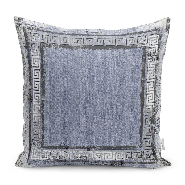 RealHomes Mavi Zeminde Çerçeveli Motifli Antik Desenli Dijital Baskılı Yastık Kırlent Kılıfı