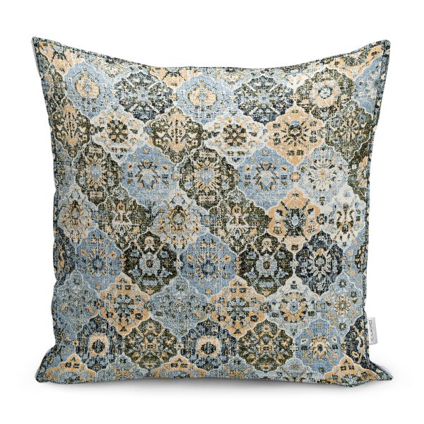 RealHomes Mavi Zeminde Dokuma Halı Motifli Eskitme Desenli Dijital Baskılı Yastık Kırlent Kılıfı
