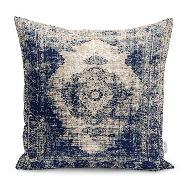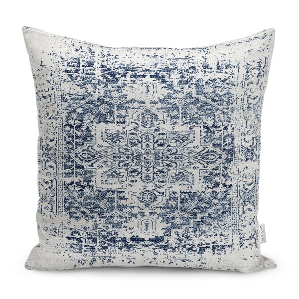 RealHomes Mavi Zeminde Eskitme Motifli Göbekli Halı Desenli Dijital Baskılı Yastık Kırlent Kılıfı