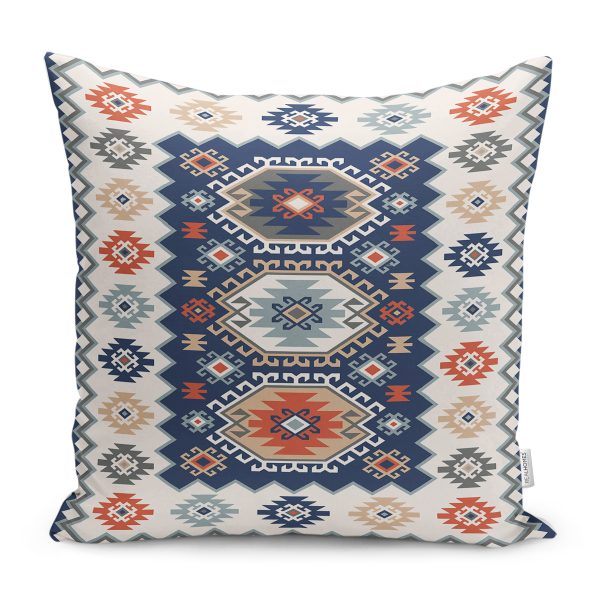 RealHomes Mavi Zeminde Etnik Motifli Kilim Desenli Dijital Baskılı Yastık Kırlent Kılıfı