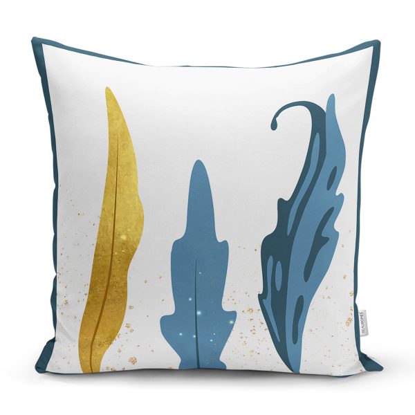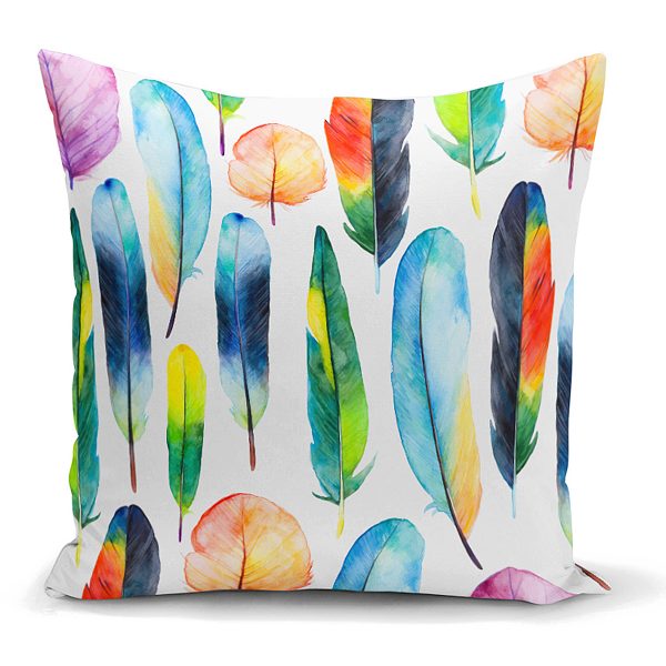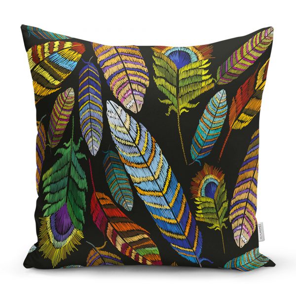 Renkli Tüyler ve Yapraklar Resimli Dekoratif Yastık Kırlent Kılıfı