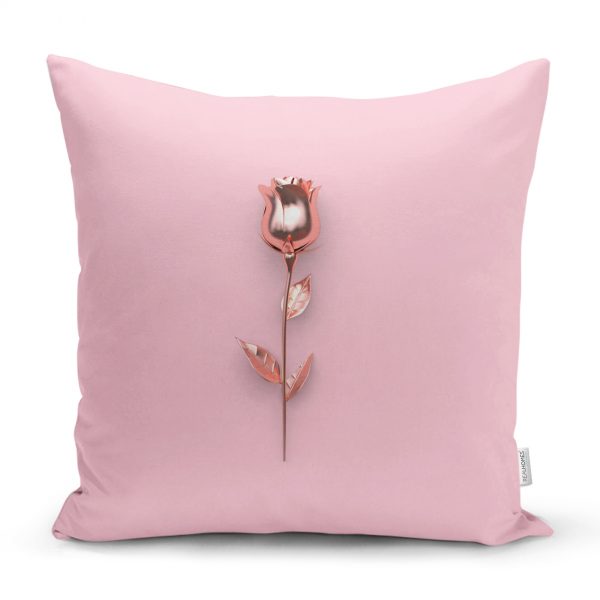 Pembe Zeminli Altın Gül 3D Baskılı Yastık Kırlent Kılıfı