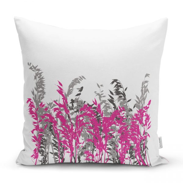 Beyaz Zeminde Gri Ve Fuşya Çiçek Baskılı Kırlent Kılıfı