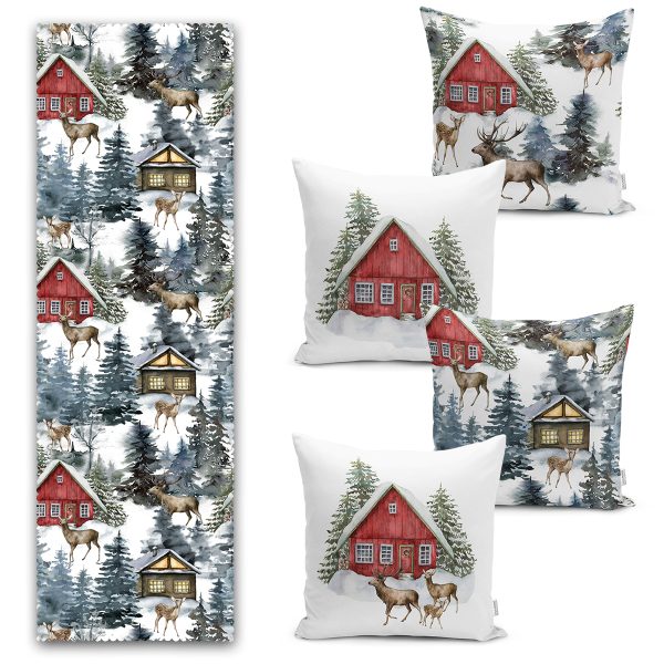 Kış Temalı Bağ Evi Konseptli Özel Tasarım 4 Kırlent 1 Runner Seti