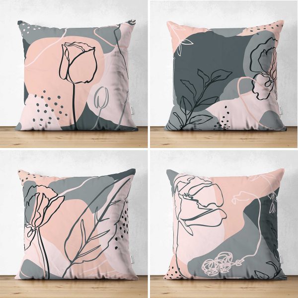 Çift Taraflı Pembe Zeminde Gül Ve Yaprak Desenli 4’Lü Süet Kırlent Kılıf Seti