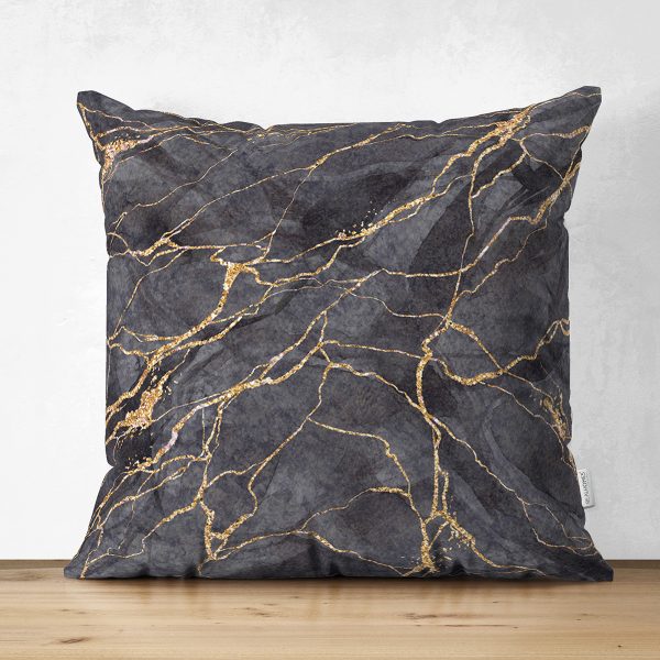 Çift Taraflı Siyah Zemin Üzerinde Gold Detaylı Mermer Desenli Modern Süet Yastık Kırlent Kılıfı