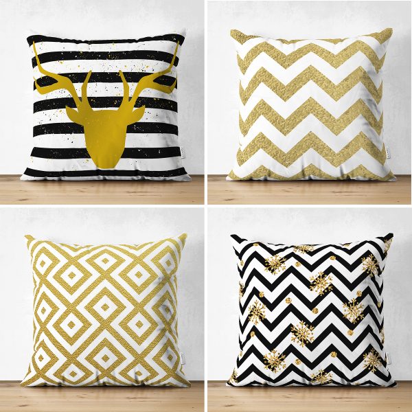 Realhomes Çift Taraflı Altın Varaklı Geometrik Desenli Modern 4’lü Süet Yastık Kırlent Kılıf Seti
