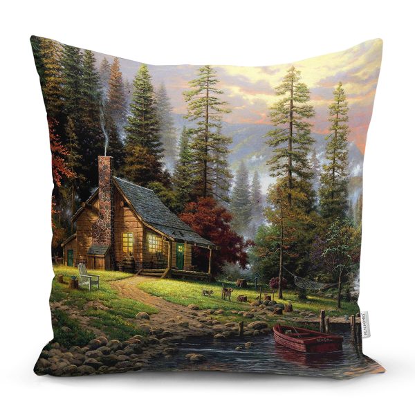 Dağ Evi Manzaralı Dijital Baskılı Modern Yastık Kırlent Kılıfı