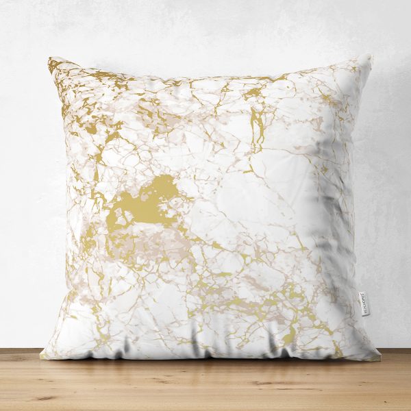 Çift Taraflı Mermer Motifli Gold İşlemeli Dijital Baskılı Modern Süet Yastık Kırlent Kılıfı
