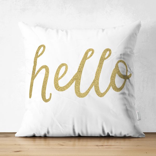 Çift Taraflı Beyaz Zeminde Gold Hello Yazılı Dijital Baskılı Modern Süet Yastık Kırlent Kılıfı
