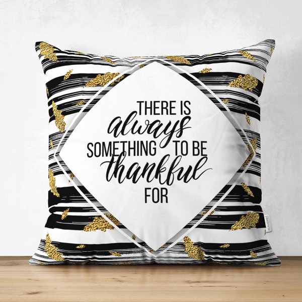 Çift Taraflı Siyah Beyaz Zeminde Gold Yapraklı Thanks Yazılı Modern Süet Yastık Kırlent Kılıfı