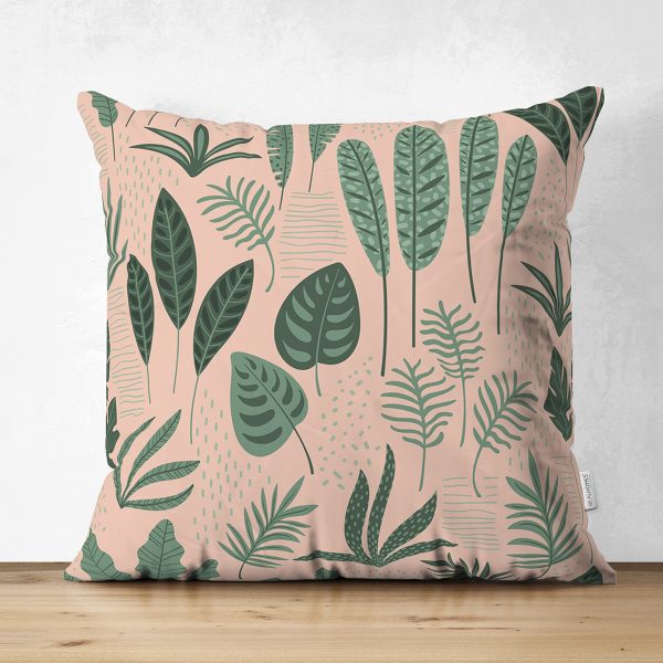 Çift Taraflı Pudra Zemin Üzerinde Yeşil Yapraklı Dijital Baskılı Modern Süet Yastık Kırlent Kılıfı