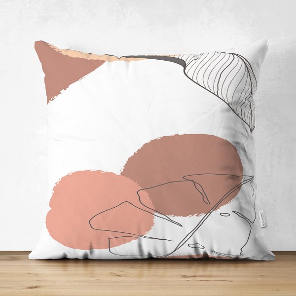 Çift Taraflı Beyaz Zemin Üzerinde Onedraw Çizimli Yaprak Motifli Süet Yastık Kırlent Kılıfı