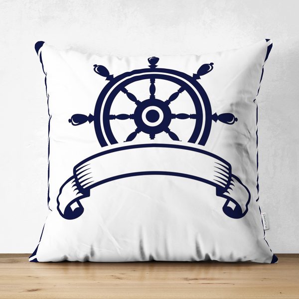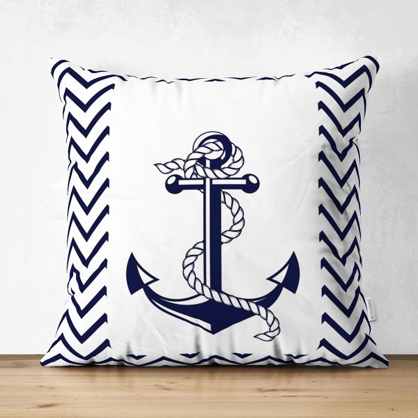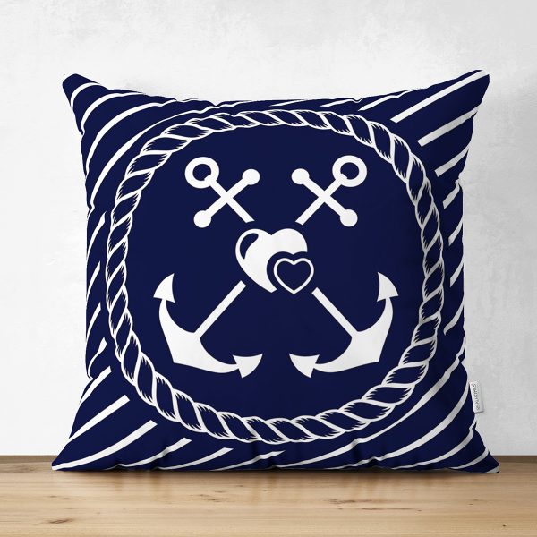 Çift Taraflı Lacivert Zemin Üzerinde Çapa Çizimli Dijital Baskılı Modern Süet Yastık Kırlent Kılıfı