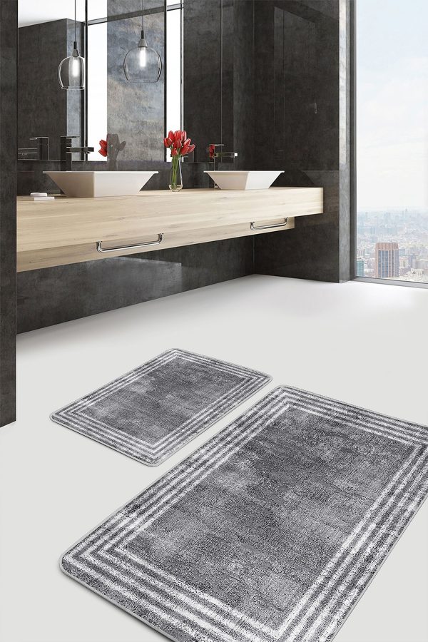 2’li Set Gri – Beyaz Zeminde Çerçeveli Motifli Antik Desenli Sade & Şık Vintage 2’li Banyo & Mutfak Paspas Takımı