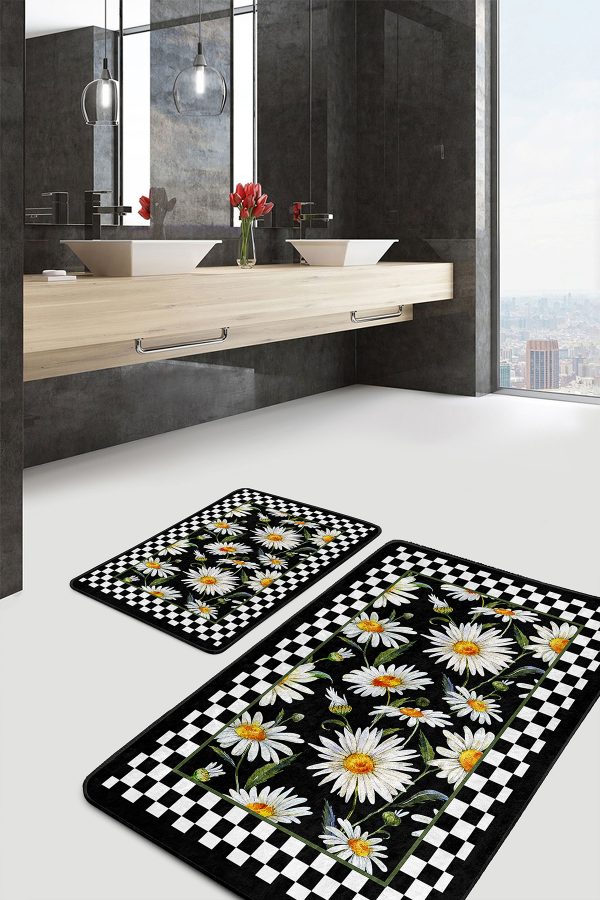 2’li Set Siyah – Beyaz Zeminde Çerçeveli Motifli Papatya Desenli Floral Sade & Şık 2’li Banyo & Mutfak Paspas Takımı