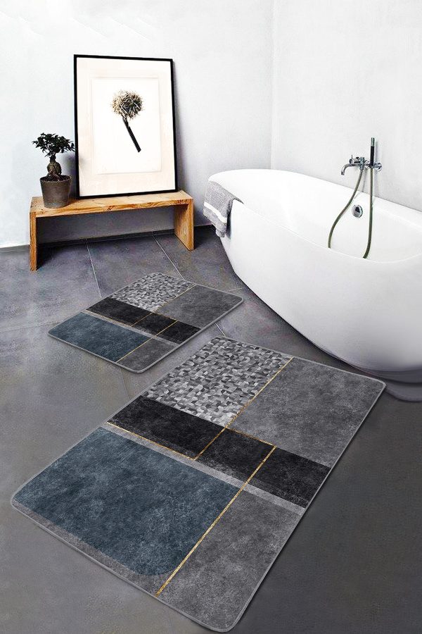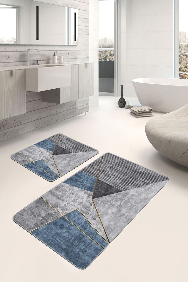 2’li Set Gri – Mavi Zeminde Geometrik Motifli Gold Desenli Geometrik Modern 2’li Banyo & Mutfak Paspas Takımı