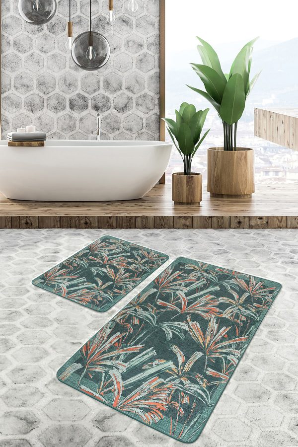 2’li Set Yeşil Zeminde Çiçek Motifli El Dokuma Desenli Summer & Fresh Floral 2’li Banyo & Mutfak Paspas Takımı