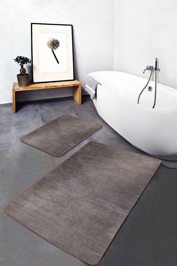 2’li Set Füme Zeminde Çerçeveli Motifli Klasik Desenli Sade & Şık Klasik 2’li Banyo & Mutfak Paspas Takımı