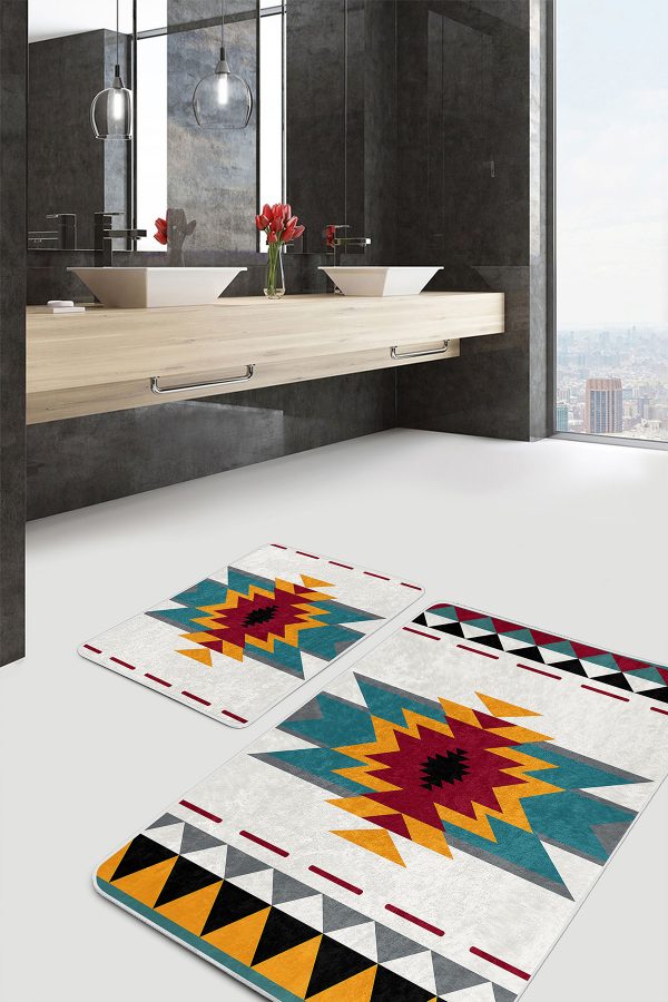 2’li Set Krem Zeminde Geleneksel Motifli Kilim Desenli Etnik Motifler Geometrik 2’li Banyo & Mutfak Paspas Takımı