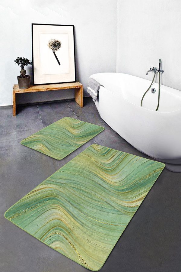 2’li Set Yeşil – Gold Zeminde Altın Motifli Mermer Desenli Sade & Şık Klasik 2’li Banyo & Mutfak Paspas Takımı