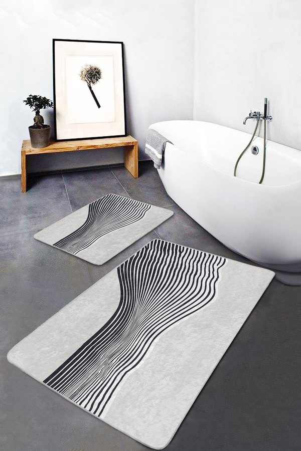 2’li Set Gri – Ekru Zeminde Modern Sanat Motifli Klasik Desenli Sade & Şık Modern 2’li Banyo & Mutfak Paspas Takımı