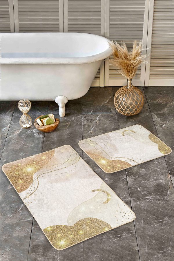 2’li Set Gold Zeminde Gold Motifli Klasik Desenli Geometrik Sade & Şık 2’li Banyo & Mutfak Paspas Takımı