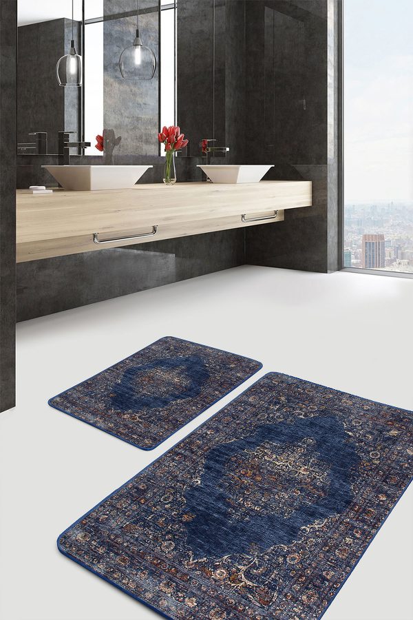 2’li Set Lacivert Zeminde Osmanlı Motifli Altın Detay Desenli Avangarde Eskitme Motifli 2’li Banyo & Mutfak Paspas Takımı