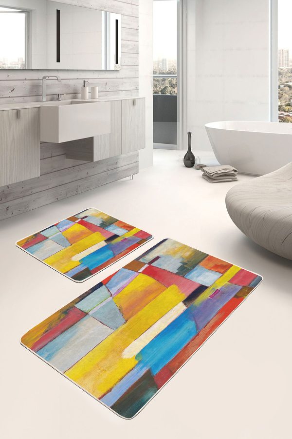 2’li Set Renkli Zeminde Soyut Motifli Sulu Boya Desenli Klasik Modern 2’li Banyo & Mutfak Paspas Takımı