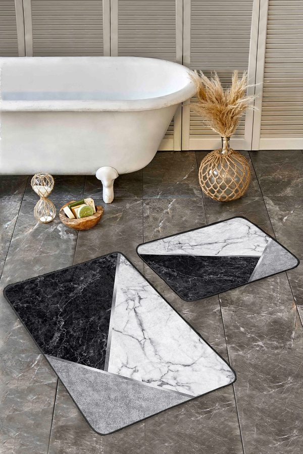 2’li Set Siyah – Gri Zeminde Mermer Motifli Klasik Desenli Geometrik Sade & Şık 2’li Banyo & Mutfak Paspas Takımı