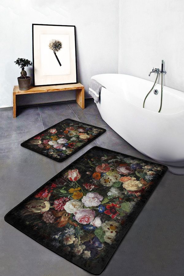 2’li Set Siyah Zeminde Çiçek Motifli Yapraklar Desenli Floral Klasik 2’li Banyo & Mutfak Paspas Takımı