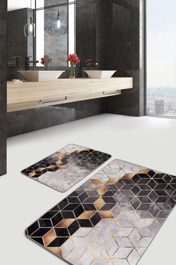 2’li Set Siyah – Gold Zeminde Geometrik Motifli Mozaik Desenli Geometrik Sade & Şık 2’li Banyo & Mutfak Paspas Takımı