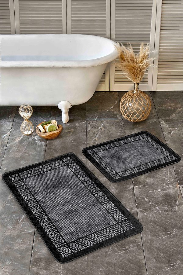 2’li Set Siyah Zeminde Çerçeveli Motifli Klasik Desenli Geometrik Klasik 2’li Banyo & Mutfak Paspas Takımı