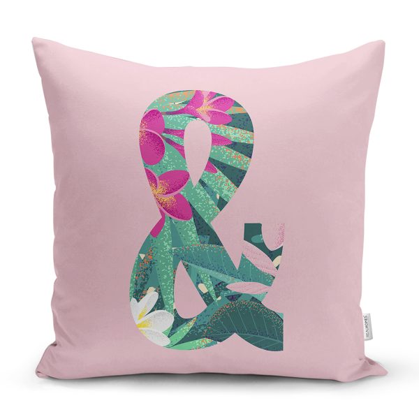 Pembe Zemin Tropik Yapraklı V Harfi Özel Tasarım Dijital Baskılı Yastık Kırlent Kılıfı