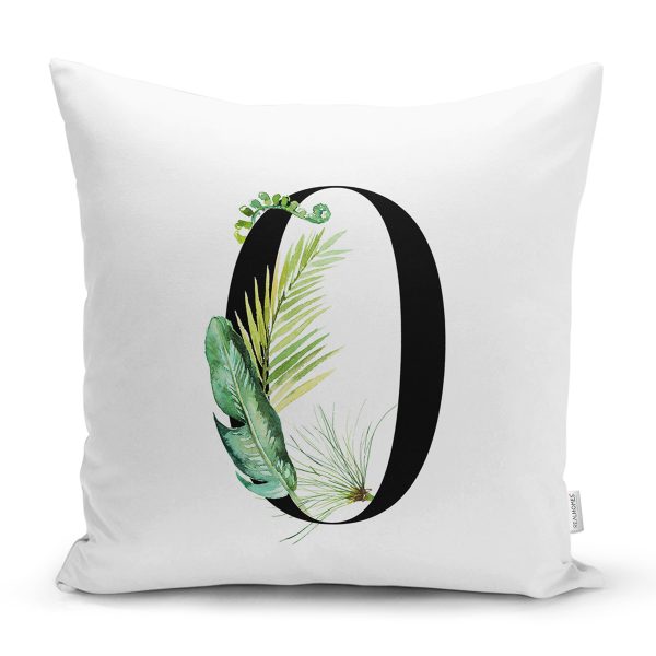 Beyaz Zemin Yaprak Motifli Siyah 0 Rakamı Özel Tasarım Dijital Baskılı Yastık Kırlent Kılıfı
