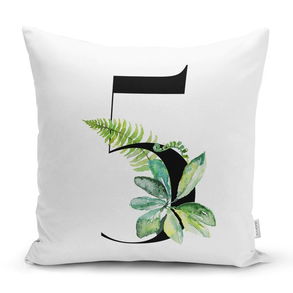 Beyaz Zemin Yaprak Motifli Siyah 5 Rakamı Özel Tasarım Dijital Baskılı Yastık Kırlent Kılıfı