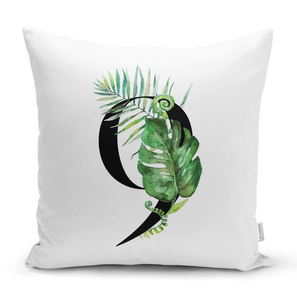 Beyaz Zemin Yaprak Motifli Siyah J Harfi Özel Tasarım Dijital Baskılı Yastık Kırlent Kılıfı