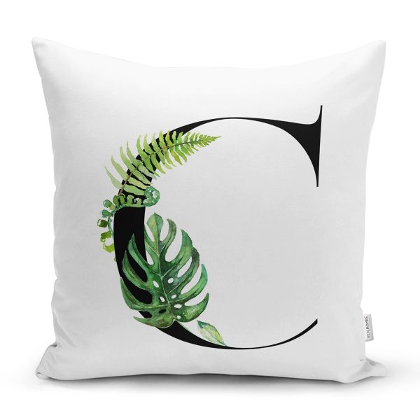 Beyaz Zemin Yaprak Motifli Siyah C Harfi Özel Tasarım Dijital Baskılı Yastık Kırlent Kılıfı