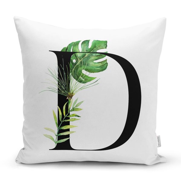 Beyaz Zemin Yaprak Motifli Siyah D Harfi Özel Tasarım Dijital Baskılı Yastık Kırlent Kılıfı