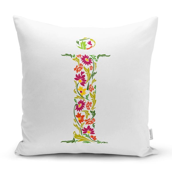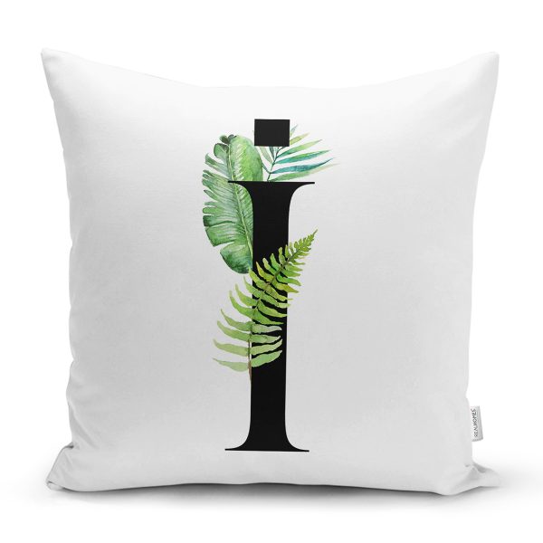 Beyaz Zemin Yaprak Temalı İ Harfi Özel Tasarım Dijital Baskılı Yastık Kırlent Kılıfı
